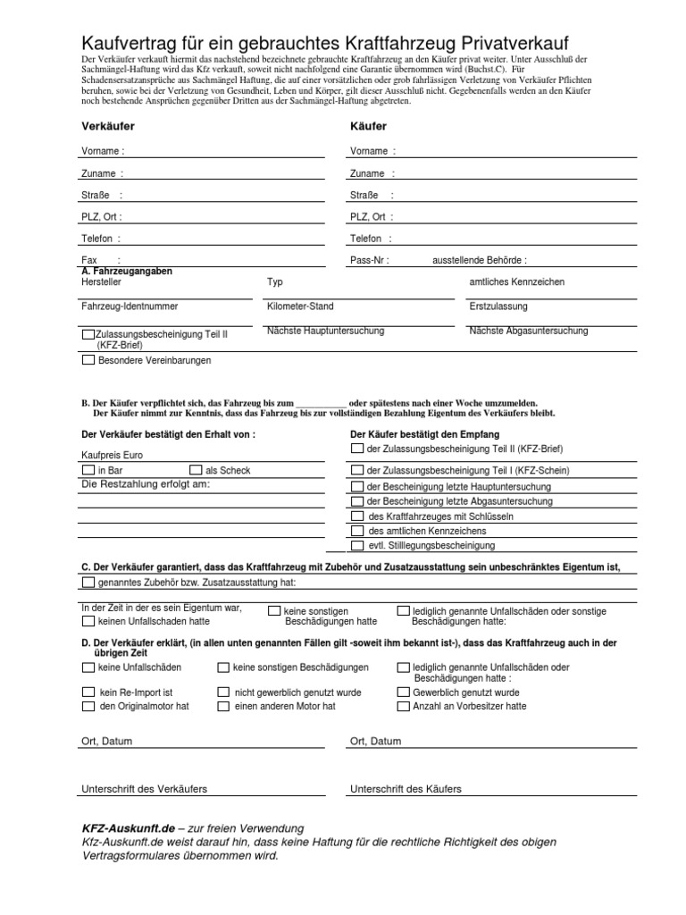 Wenn ein unternehmer ein gebrauchtes kfz verkauft, ist der in diesem vertrag enthaltene ausschluss der sachmängelhaftung unwirksam. Nämlich die des verbrauchsgüterkaufs aus dem bürgerlichen gesetzbuch (bgb). Der haftungsausschluss ist direkt im kaufvertrag schriftlich festzuhalten. Kaufvertrag für ein gebrauchtes kraftfahrzeug privatverkauf der verkäufer verkauft hiermit das nachstehend bezeichnete gebrauchte kraftfahrzeug an den käufer privat weiter.